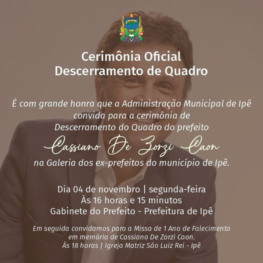 É com grande honra que a Administração Municipal de Ipê convida para a cerimônia de Descerramento do Quadro do prefeito Cassiano De Zorzi Caon na Galeria dos ex-prefeitos do município de Ipê.
