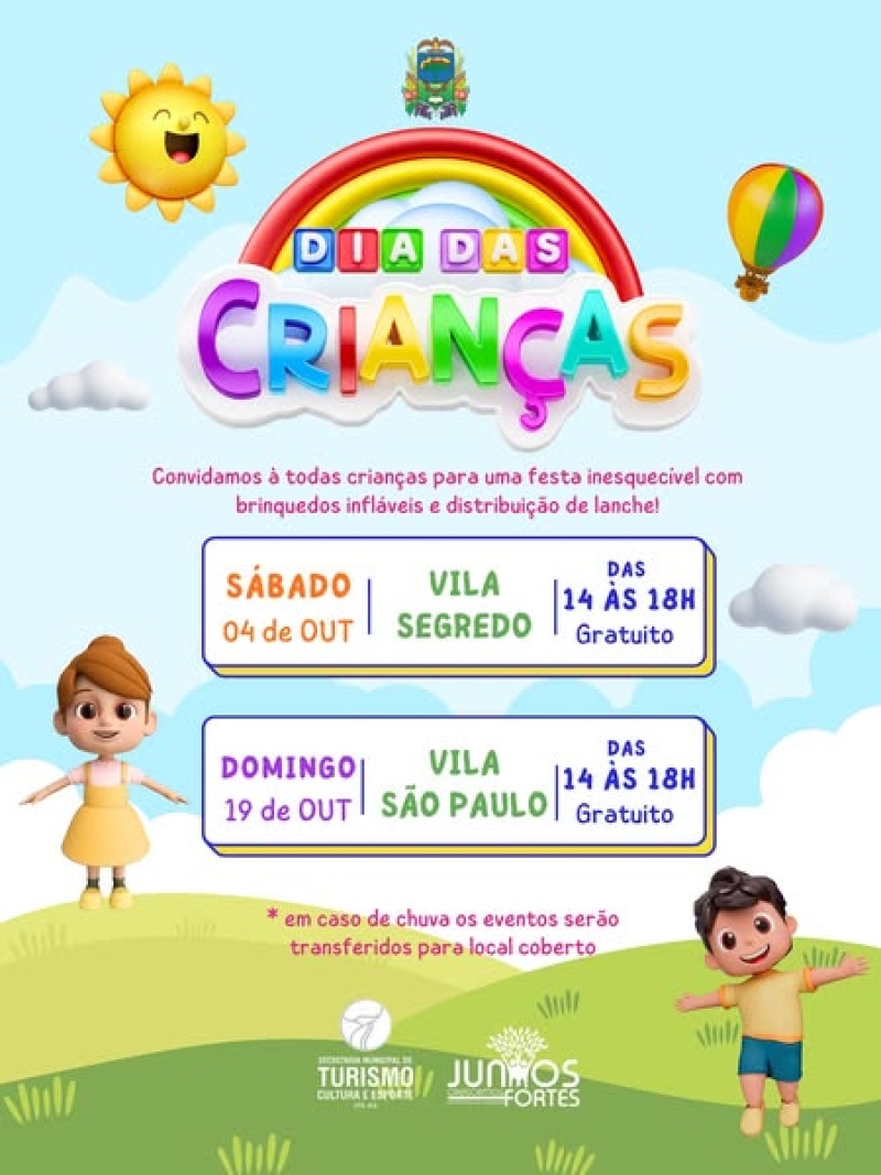 Em caso de chuva, os eventos serão transferidos para locais cobertos, garantindo a diversão das crianças em segurança.