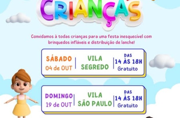 As festas serão realizadas em três locais do município, com entrada gratuita, brinquedos infláveis e distribuição de lanches:
