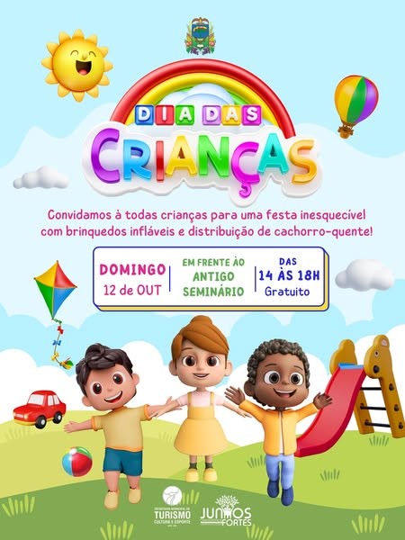 A Prefeitura de Ipê, por meio da Secretaria de Turismo, Cultura e Esporte, convida todas as crianças para viver momentos de alegria, diversão e encantamento nas comemorações do Dia das Crianças.