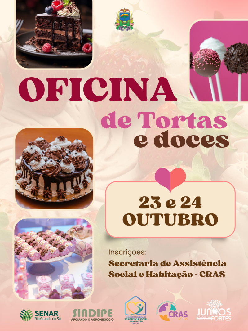 A Prefeitura Municipal de Ipê, por meio da Secretaria de Assistência Social e Habitação e do CRAS, promove nos dias 23 e 24 de outubro a Oficina de Tortas e Doces.